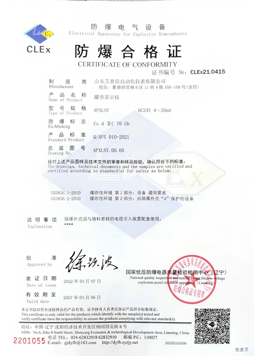 標準款音叉物位開關,優質防爆鑄造鋁殼,不銹鋼銘牌,sus316叉體材質。 型號:APXYC504 應用:液體/粉體 供電:24VDC/220AC 輸出:繼電器(DPDT) 連接過程:G1''螺紋 叉體長度:100mm 介質溫度:-30℃-80℃ 壓力:≤4MPa 防爆等級:Exd IIC T6 Gb 防護等級:IP65